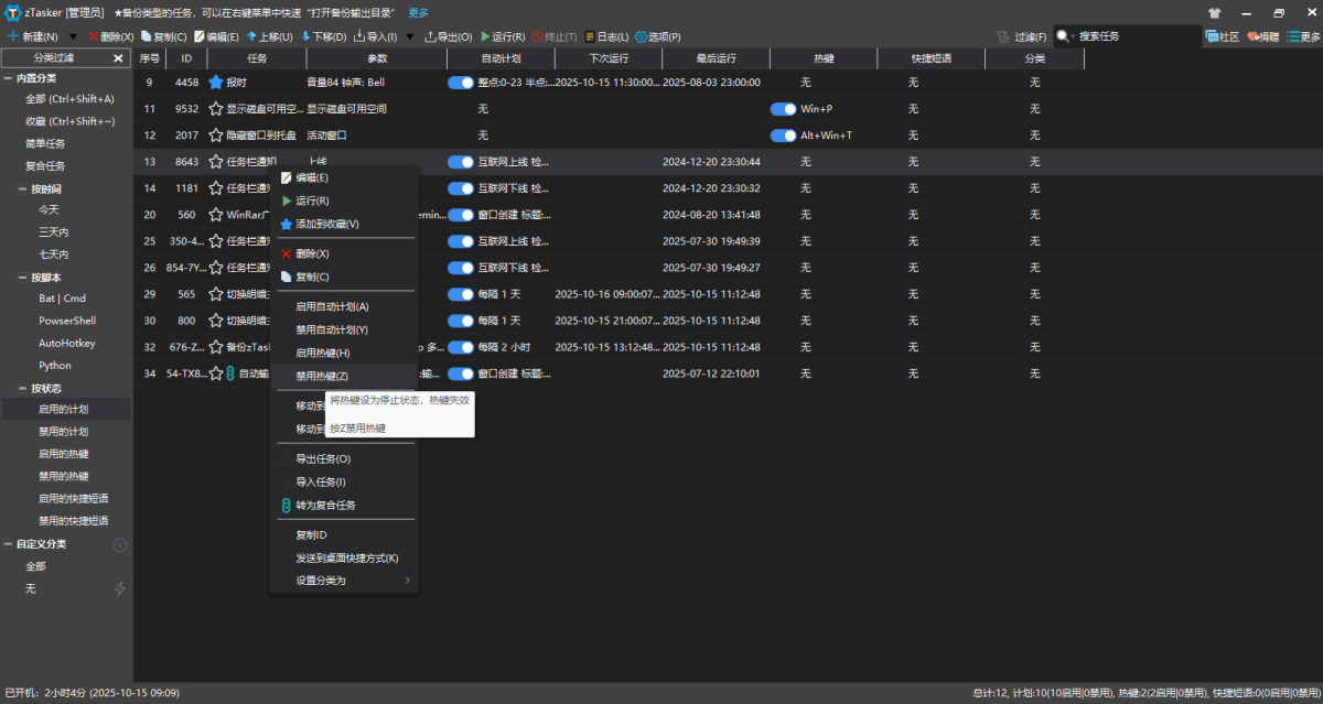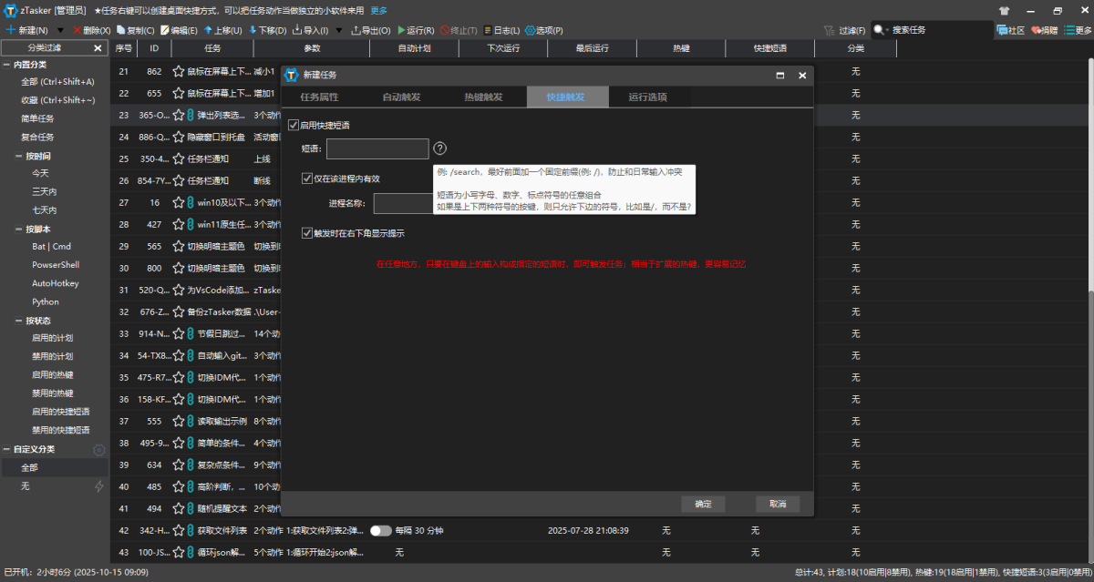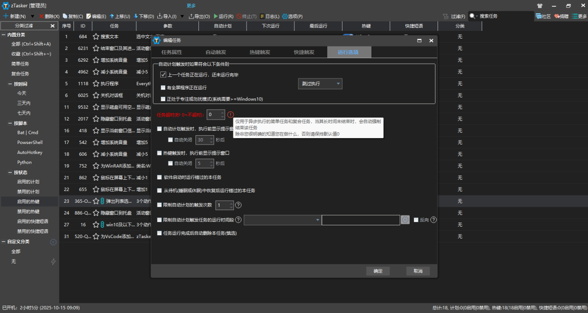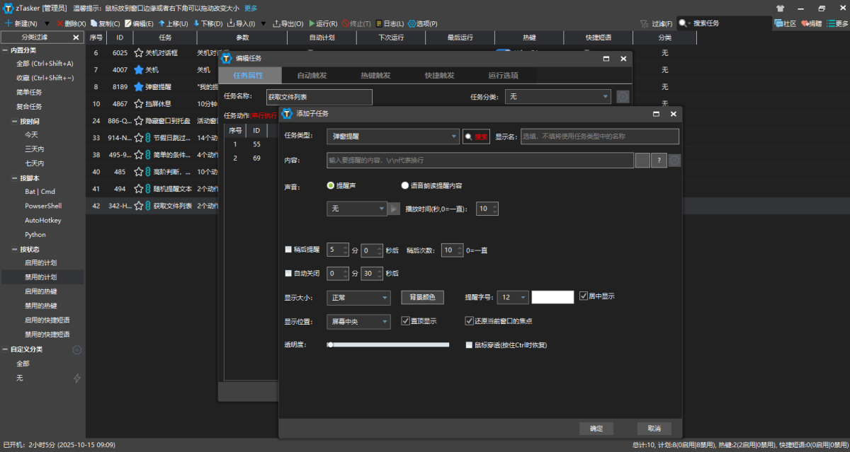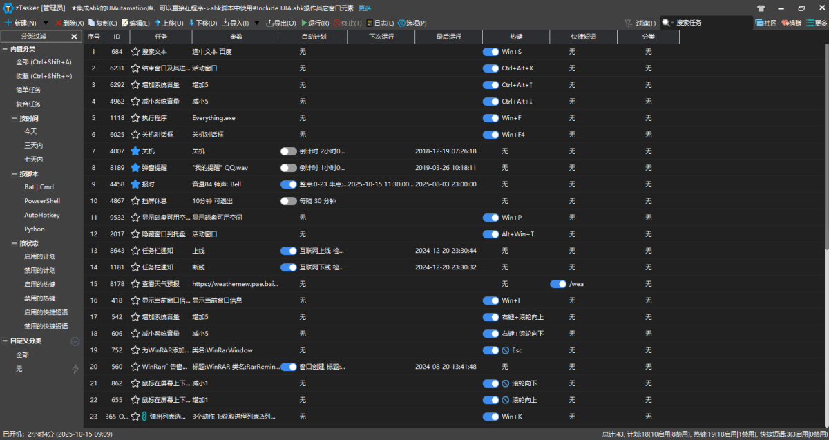 zTasker是一款支持定时、热键或条件触发的方式执行多种自动化任务的小工具,其支持超过200种任务类型,50+种定时/条件执行方法,而且任务列表可以随意编辑、排列、移动、更改类型,支持任务执行日志,可覆盖win自带的热键,同时支持任务列表等数据的备份及自动更新等。zTasker采用C++语言构建、插件化架构、高度复用可维护的设计模式,对算法和流程进行了优化。