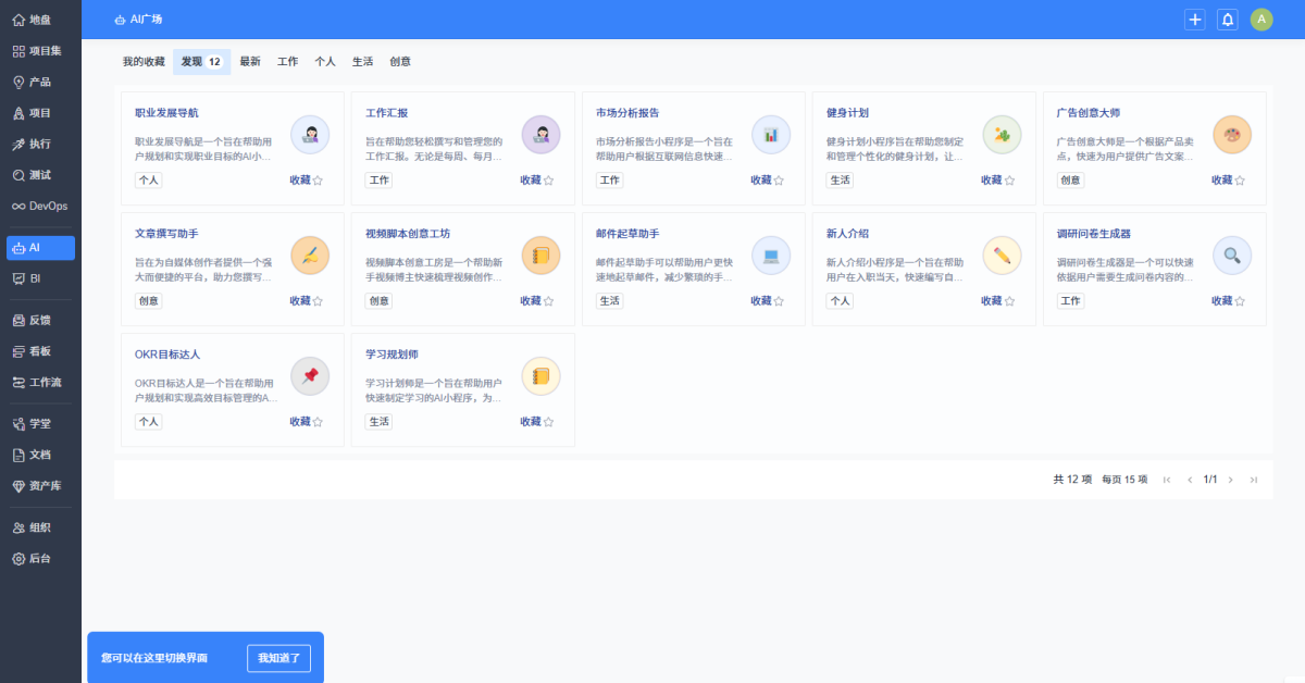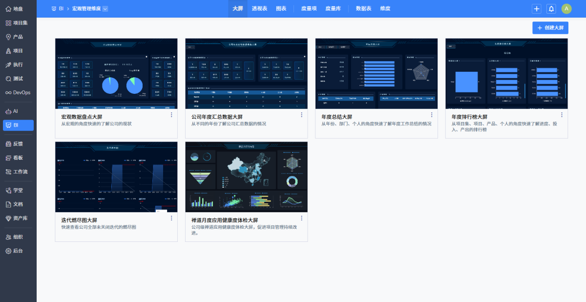 个人仪表盘、产品仪表盘、项目仪表盘、测试仪表盘、文档仪表盘等各类信息总览。