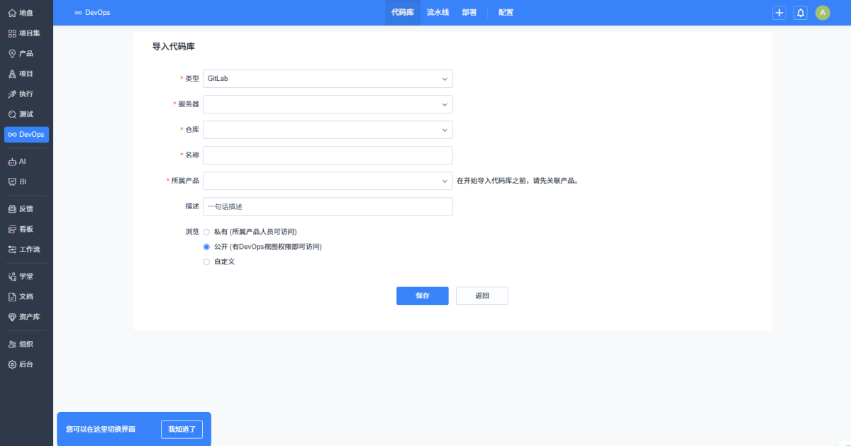 对接Git服务;代码管理:代码库关联产品、浏览代码、分支列表、标签列表、代码对比、代码与需求/任务/Bug关联;合并请求管理;对接GitLab流水线、Jenkins流水线;手动触发、代码库事件触发、定时触发、查看历史和详情。