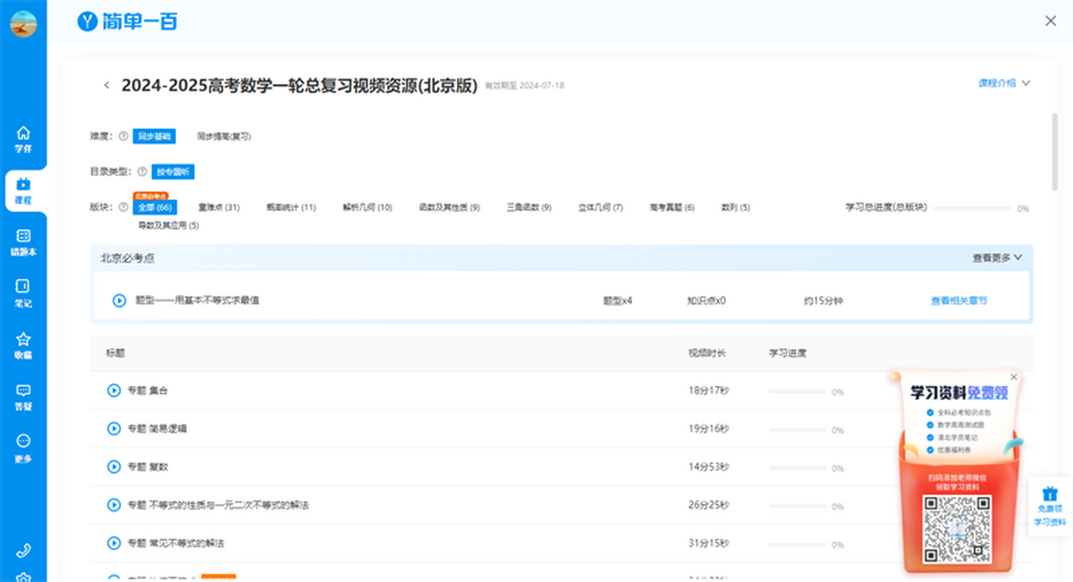 简单学习网(已升级为简单一百)是一款功能全面的教育学习类软件,简单学习网电脑版拥有初中、高中各年级、各版本数百门优质名师课程,全部课程以短视频形式呈现,支持离线下载,坐公交、搭地铁等碎片化时间轻松学习,哪里不会学哪里,轻松成为学霸。