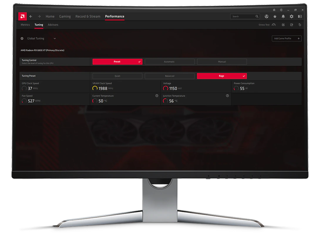 Adrenalin Edition 具有适用于 AMD Radeon RX 6800 和 RX 6900 系列显卡的性能调优预设。一键式预设可快速调整显卡的功耗级别,满足您的性能或节能需求。Radeon RX 6800 XT 和 Radeon RX 6900 XT GPU 可通过 Rage 模式全面释放 GPU 性能,实现卓越的游戏体验。