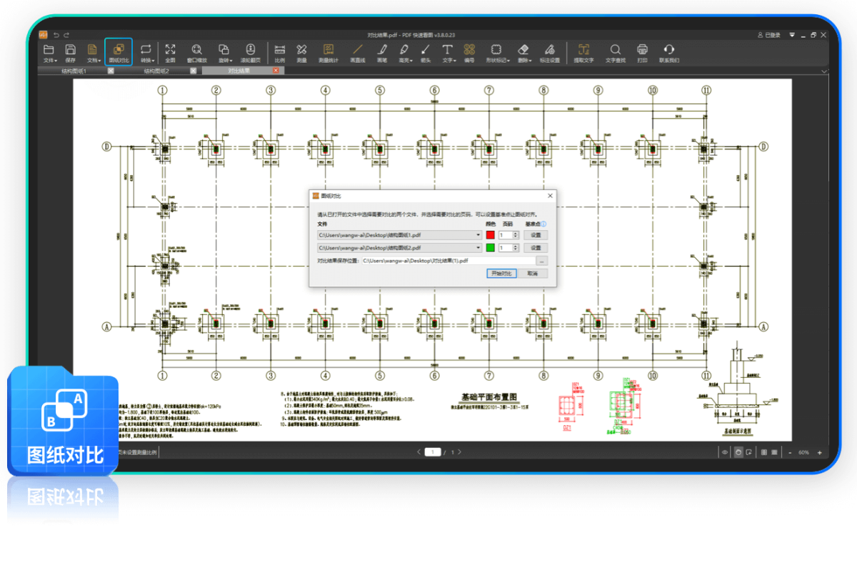 将不同版次图纸重叠显示,通过基准点对齐有缩放和偏移的图纸,快速查看变更与差异,对比结果还能保存与分享。