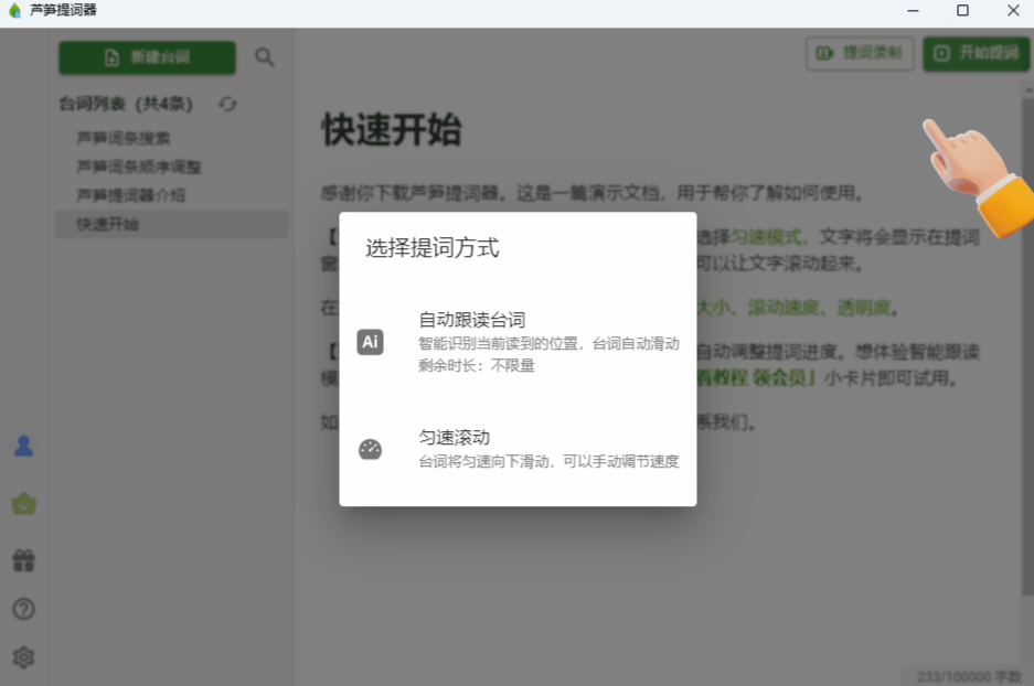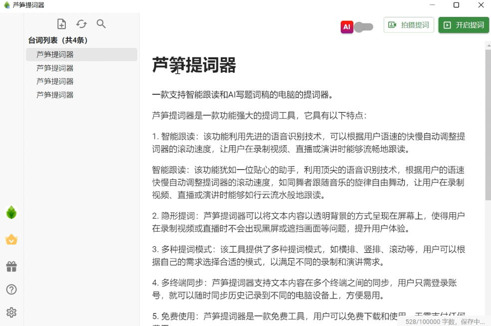 芦笋提词器是一款支持智能跟读和 AI 生成提词稿的提词器。支持隐形提词效果,录屏或分享桌面时,提词器内容仅自己可见。