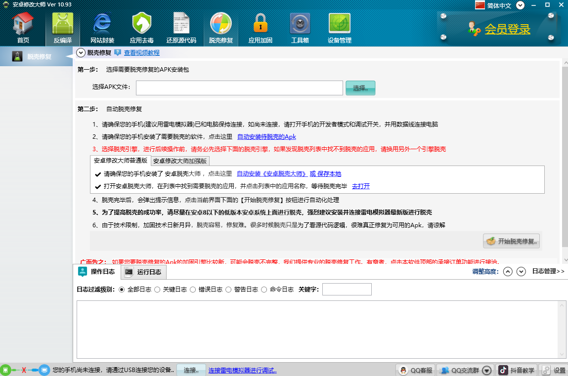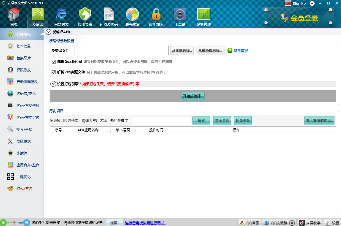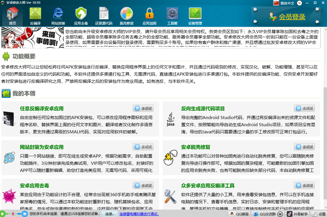 安卓版下载 大小:13.6MB 下载:3256次 安卓修改大师 免费 下载 支 持:win10 分 类:电脑软件 大 小:13.6MB 版 本:正式版11.08.0官方版 评 分: 开发者:极速下载站 下载量:3256次 发 布:2026-04-06 01:42 手机扫码免费下载 #安卓修改大师截图 #安卓修改大师简介 安卓修改大师电脑版是一款可以让用户轻松将任何APK安装包进行反编译,替换应用的程序界面上的任何文字和图片的工具软件。还提供多渠道打包工具,无需源代码,直接通过APK安装包进行多渠道打包。