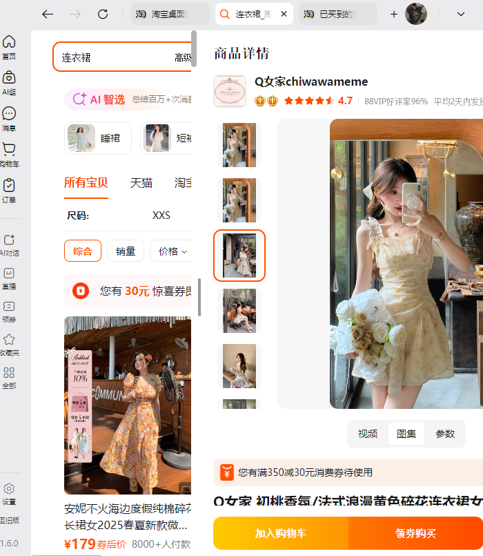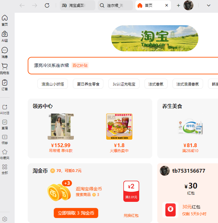 安卓版下载 大小:121MB 下载:3256次 淘宝桌面版 免费 下载 支 持:win10 分 类:电脑软件 大 小:121MB 版 本:正式版 1.5.6官方版 评 分: 开发者:极速下载站 下载量:3256次 发 布:2026-04-07 01:44 手机扫码免费下载 #淘宝桌面版截图 #淘宝桌面版简介 淘宝桌面版为提升淘宝用户在PC电脑端体验,继承网页版核心功能,更深入利用操作系统能力给淘宝用户提供快速、高效的购物支持。帮助用户在电脑上随时随地极速的打开淘宝、更加方便的和卖家进行沟通、并且更加充分的利用电脑大屏幕创造一些独特的购物体验。 软件亮点 1、分屏浏览 分屏显示,丝滑浏览。 2、高效沟通 卖家消息,即时提醒。 3、极速打开 全新页面,桌面访问。 4、AI对话 全球顶级开源模型通义Qwen3和Deepseek,无限量使用。