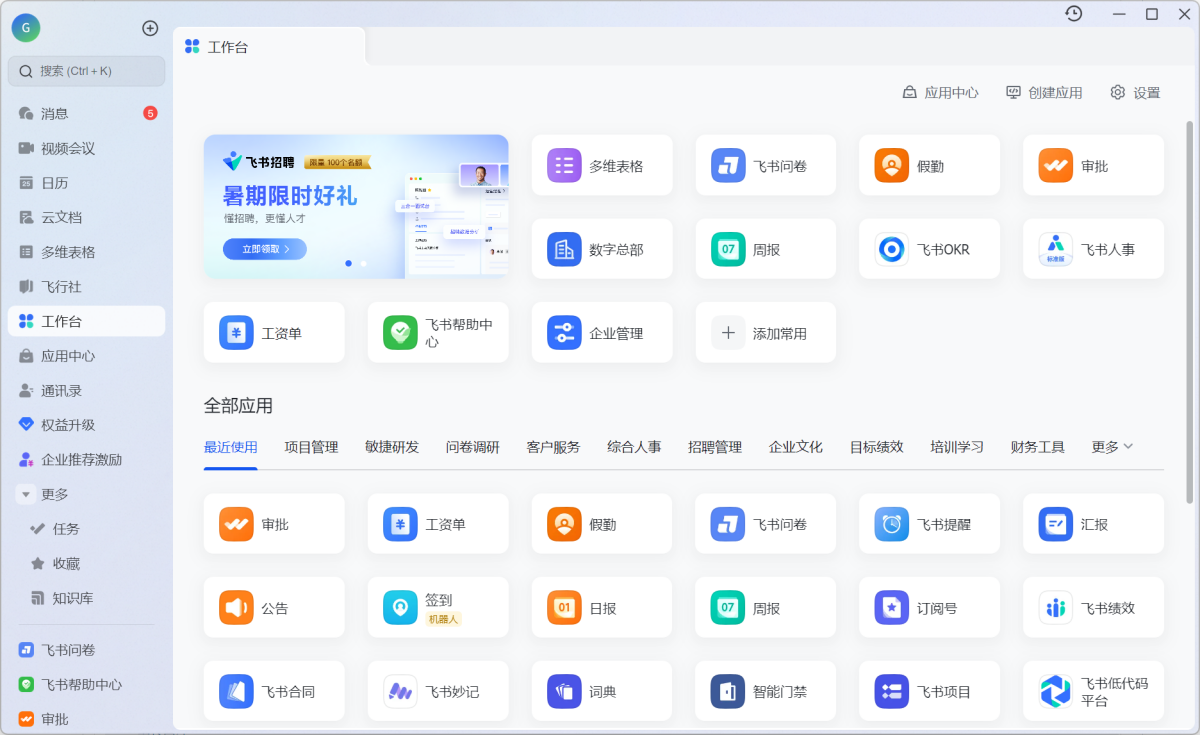 飞书不仅一站式整合及时沟通、智能日历、音视频会议、飞书文档、云盘等办公协作套件,更提供飞书OKR、飞书招聘、飞书绩效等组织管理产品,让目标更清晰,信息流动更顺畅,每一个人工作更高效更愉悦。先进团队,先用飞书。