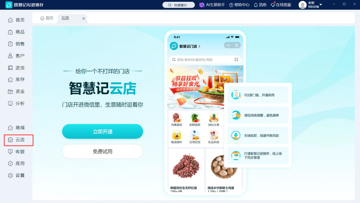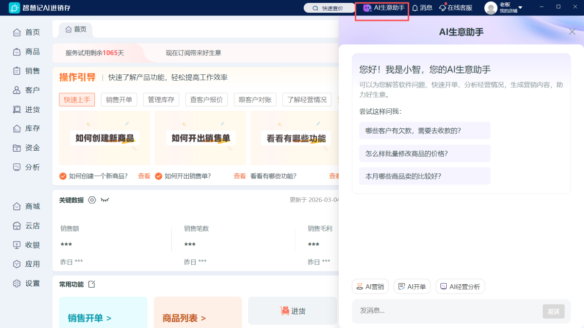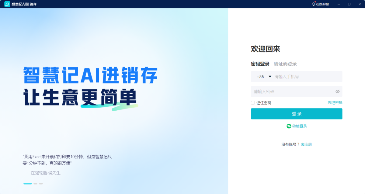 安卓版下载 大小:64.2MB 下载:3256次 智慧记AI进销存 免费 下载 支 持:win10 分 类:电脑软件 大 小:64.2MB 版 本:正式版 4.0.0官方版 评 分: 开发者:极速下载站 下载量:3256次 发 布:2026-04-07 01:46 手机扫码免费下载 #智慧记AI进销存截图 #智慧记AI进销存简介 智慧记AI进销存(原智慧记星火)是金蝶旗下专为个体商户打造的智能进销存管理软件。支持AI语音、拍照、聊天记录识别开单,内置AI经营助手一键算利润、查热销。提供极致开单、清晰库存、智能记账等核心价值,适配五金建材、食品饮料、数码家电、商超便利等30+行业,让生意管理更轻松。