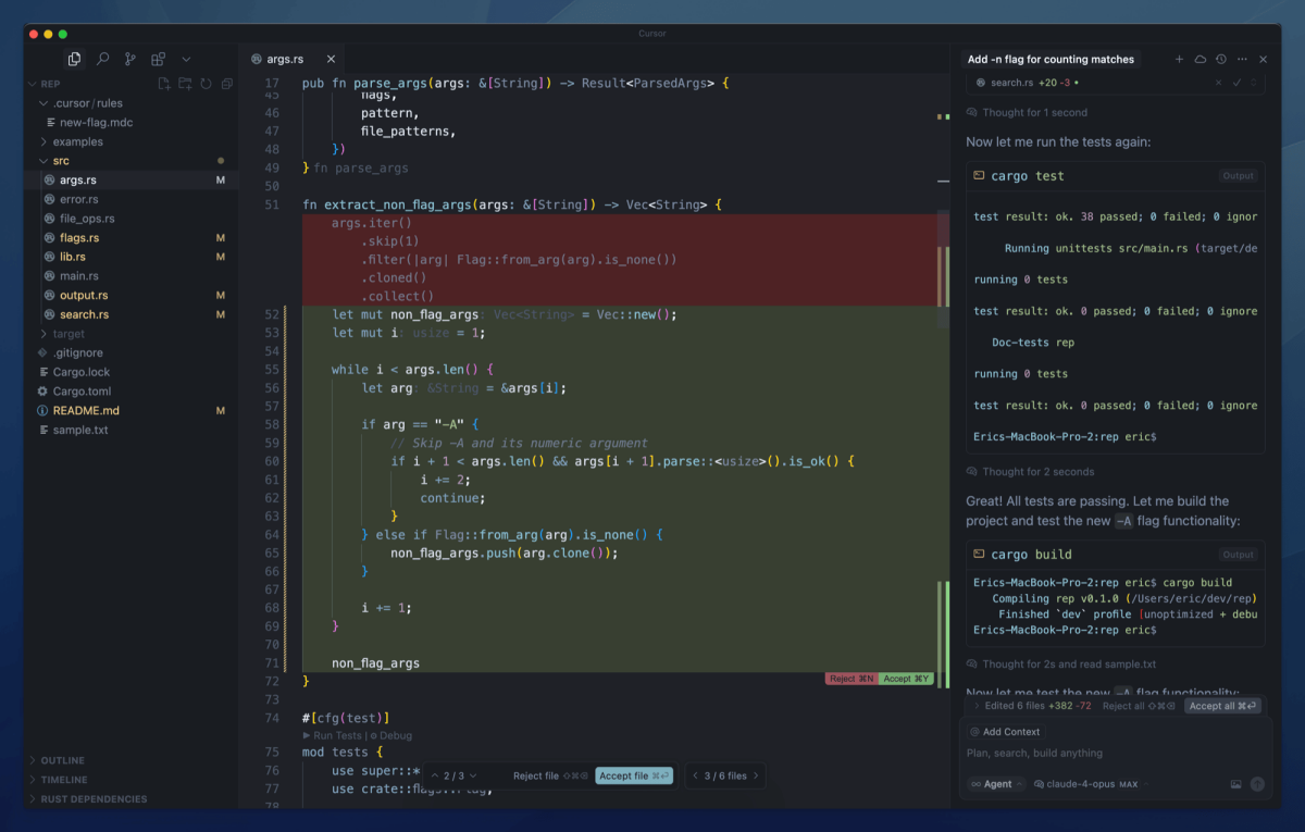 支持多个命令并行运行,可拖拽图片到提示栏,自动选择工作区域,支持规则文件(.cursorrules)定制AI行为,终端命令转换
