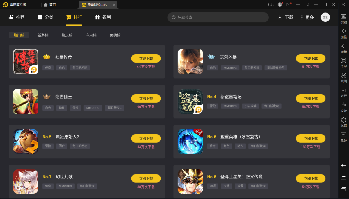 安卓版下载 大小:6.7MB 下载:3256次 雷电模拟器2026 免费 下载 支 持:win10 分 类:电脑软件 大 小:6.7MB 版 本:正式版9.1.68官方版 评 分: 开发者:极速下载站 下载量:3256次 发 布:2026-04-07 10:21 手机扫码免费下载 #雷电模拟器2026截图 #雷电模拟器2026简介 雷电模拟器采用领先内核,具有迅捷的速度和稳定的性能。来感受更大的屏幕、更快的速度、更流畅的操控体验。