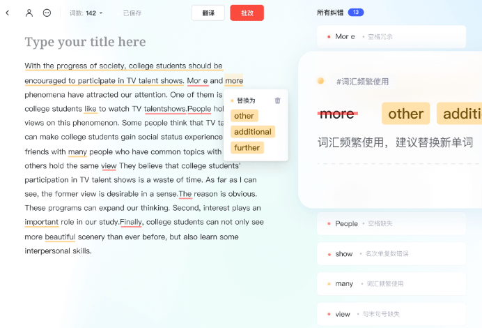 -智能纠错,智能识别200种错误,覆盖语法、词汇、拼写、格式等;