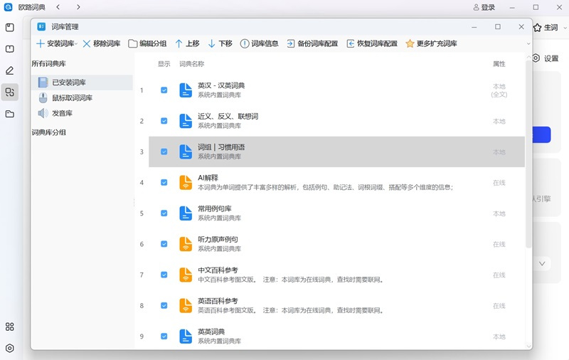 扩展词库:通过网络下载多种语言的扩展词库,支持Mdict、灵格斯、Babylon等多种词典格式,涉及医学、经济、工程、计算机等十多个领域。