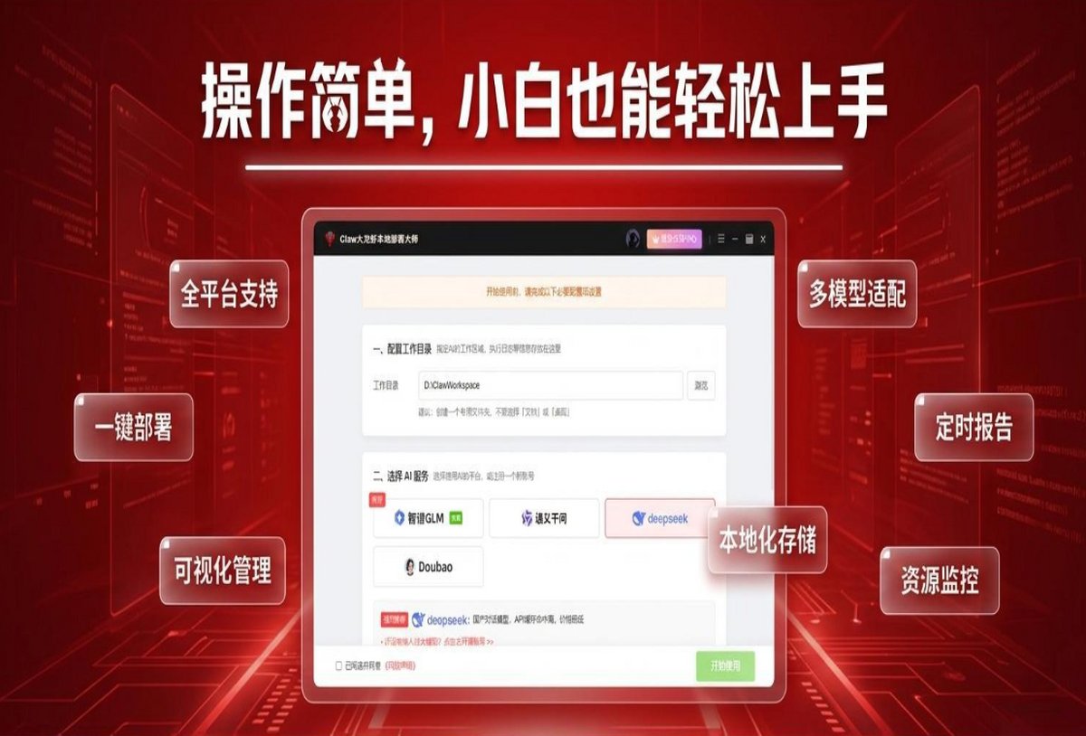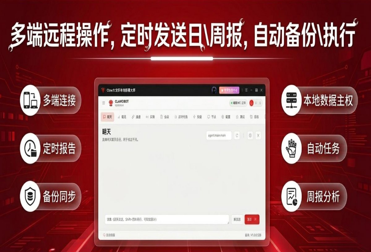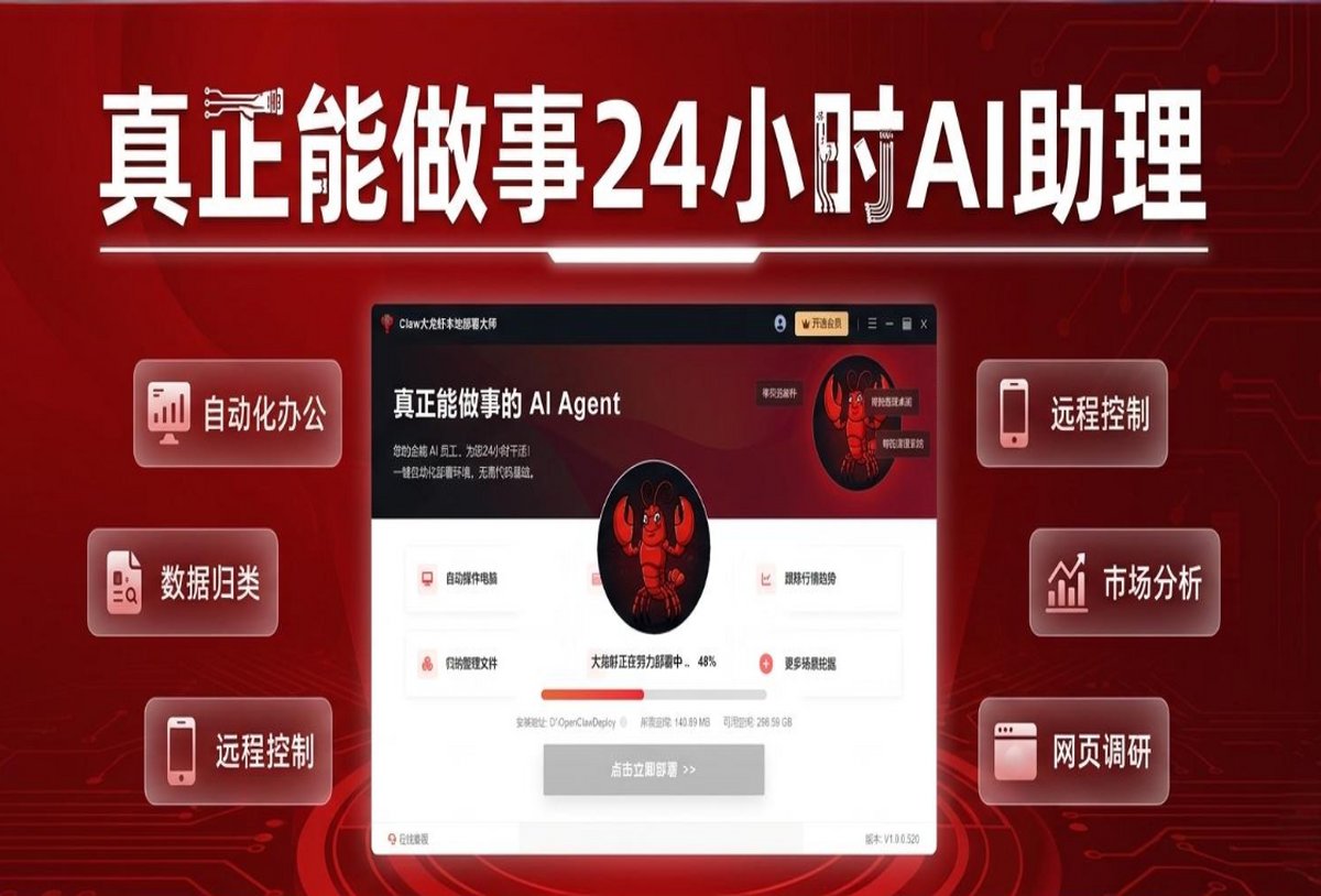 安卓版下载 大小:2.6MB 下载:4198次 Claw大龙虾本地部署大师 支 持:win10 分 类:电脑软件 大 小:2.6MB 版 本:正式版 1.2.0.0官方版 评 分: 开发者:极速下载站 下载量:4198次 发 布:2026-04-17 03:36 手机扫码免费下载 #Claw大龙虾本地部署大师截图 #Claw大龙虾本地部署大师简介 Claw大龙虾本地部署大师是一款智能体本地部署智能助手工具,一键安装即享全局掌控:网页智能生成简报、实时追踪行情趋势、自动归纳整理文档,更支持手机远程指挥电脑操作。所有数据本地处理,隐私安全无忧,让AI真正成为你随身的数字管家,高效生活从此简单。 Claw大龙虾本地部署大师,您的7×24小时高效AI助手,实用型AI Agent,简化流程自动化部署,低代码门槛易上手。