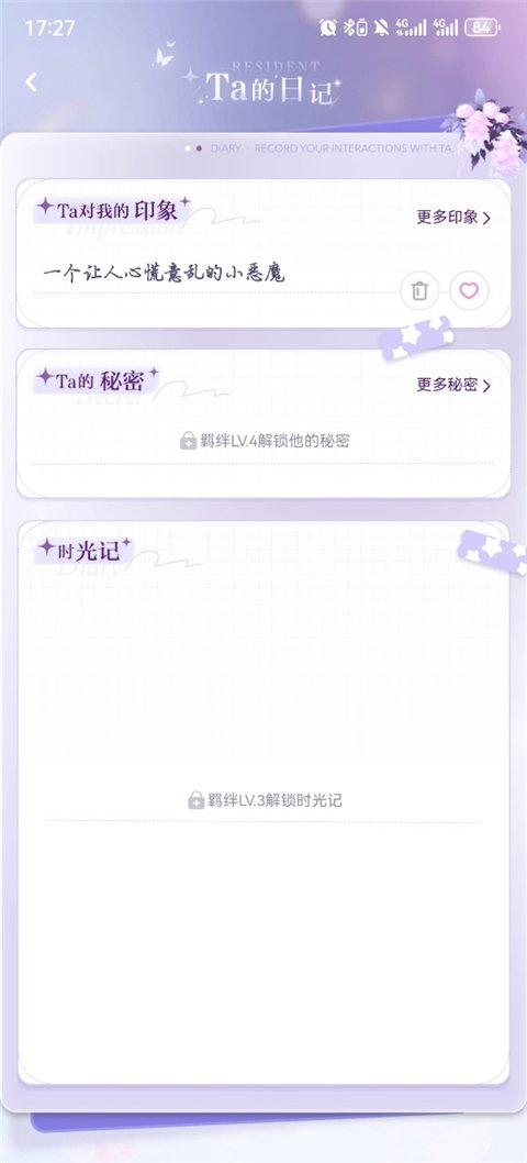 4、进入日记可以查看它对你的印象、它的秘密。