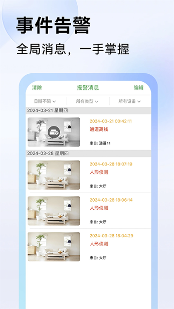 Seetong手机版是一款基于Android的远程监控软件,该软件界面简洁,功能强大,能够支持语音对讲以及音频对讲等功能,帮助用户实时图像预览、对讲、录像、截屏、画面分割、轮巡、横屏或竖屏显示,全方位满足用户的使用需求。并且不同网络环境播放模式选择、告警推送、远程录像回放、本地相册和录像回放管理等,是一款非常强大的远程监控神器。同时Seetong手机远程监控支持先进的多通道多布局方式技术,让用户对多个摄像头的画面显示,而且用户还可以对保存的位置进行选择,非常方便好用。