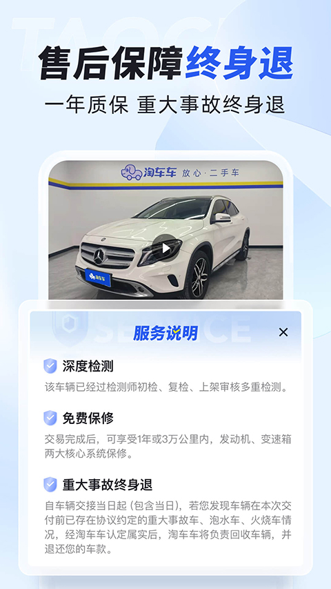 「售后无忧·终身退」1年或3万公里免费质保,重大事故终身包退。