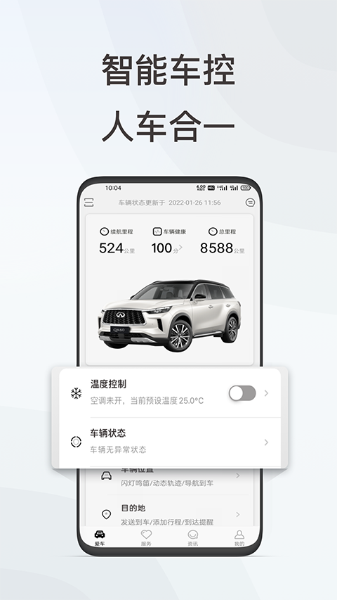 英菲智联app是是东风英菲尼迪汽车有限公司为旗下智能网联汽车推出的车主服务软件,该软件内置多种服务功能可以满足用户大部分需求实用性非常强大。同时软件里提供前所未有的智能化科技服务和个性化出行体验,使得用户可以随时掌握车辆状况,并享受优质的车载娱乐服务。