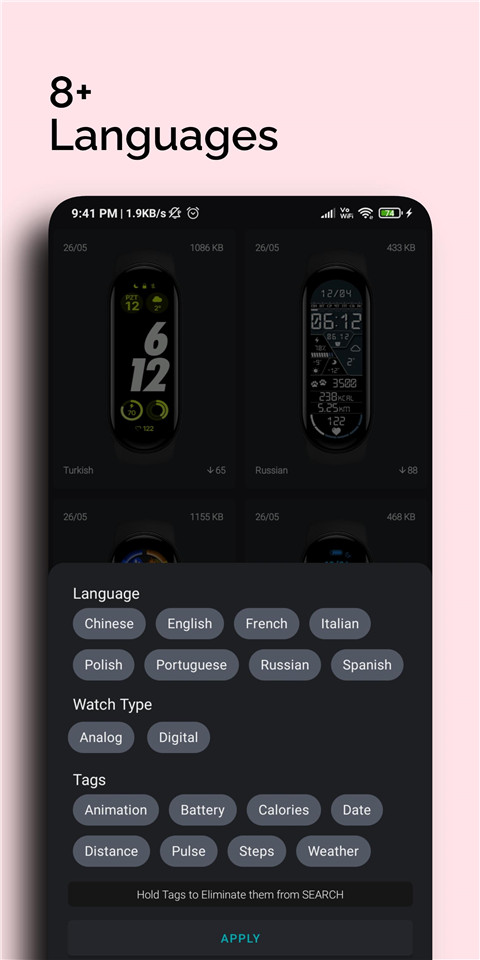 您还可以过滤动画、电池、卡路里、日期、距离、脉搏、步数、天气!