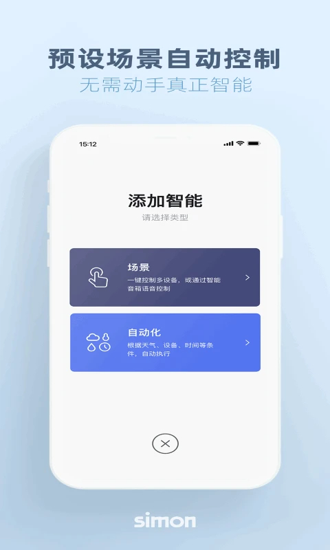 西蒙智享App是由西蒙电气(中国)有限公司针对旗下的智能家居设备开发的一款移动配套应用,使用这款软件可以快速的绑定和添加设备,查看设备的工作状态,同时还可以在手机上对家居设备进行远程遥控。点亮智能生活,欢迎来到西蒙智能家庭!“Smart西蒙App”是一个专业的智能家居管理软件, 能够帮助你快速配置, 管理你家中的西蒙智能硬件或个性化需求。 西蒙智享即是你智能家庭的编程器, 又是遥控器, 更是智能家庭的管理助手。通过西蒙智享,你可以方便地管理家中的每一个西蒙智能硬件, 查看运行状态, 更改设置参数, 灵活定义场景配置, 管理家庭用户及权限, 让你的智能家庭与众不同, 为你, 更懂你。
