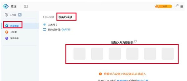 3、在电脑上安装好幕连并打开,在电脑端幕连点击【屏幕镜像】-【设备码连接】-在下方输入电视端投屏码,点击共享,即可电脑投屏电视成功。