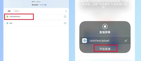 选择“LetsView【你的电视设备名称】”,在弹出的直播屏幕窗口点击【开始直播】,您的ios设备就投屏到电视上了