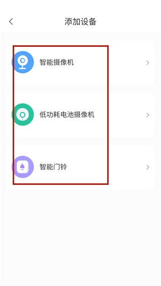 5、选择相应的设备,智能摄像机、低功耗电池摄像机或者智能门铃。